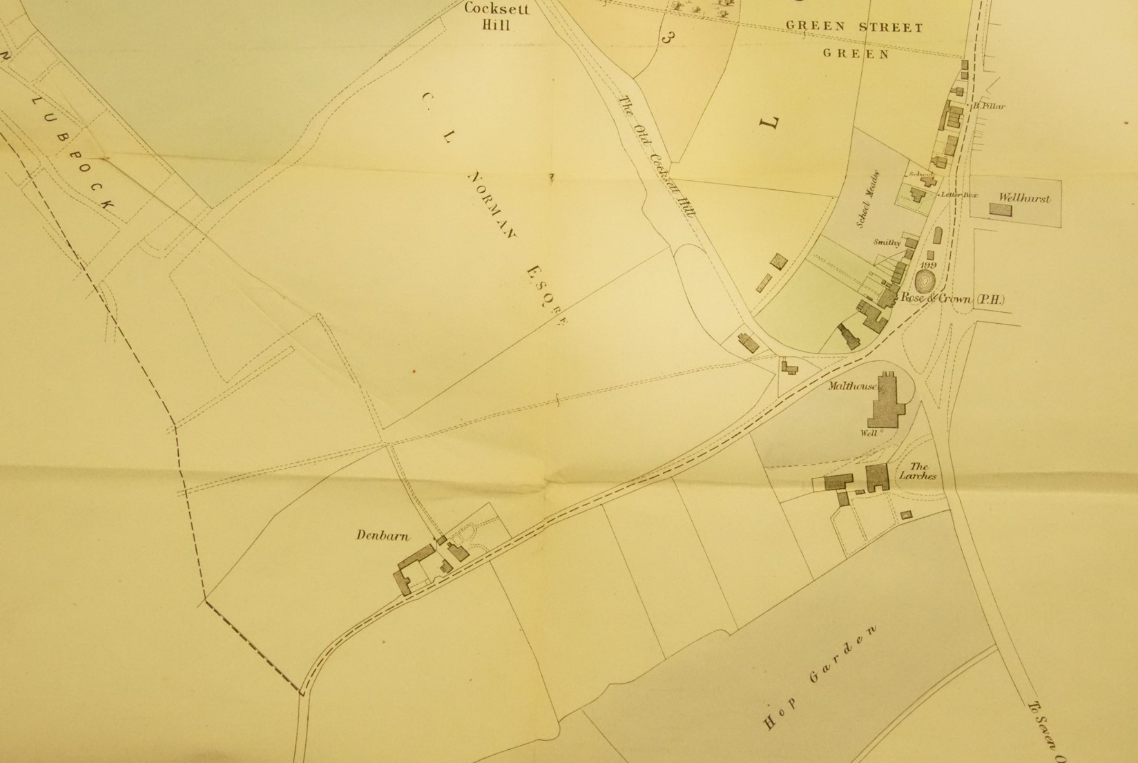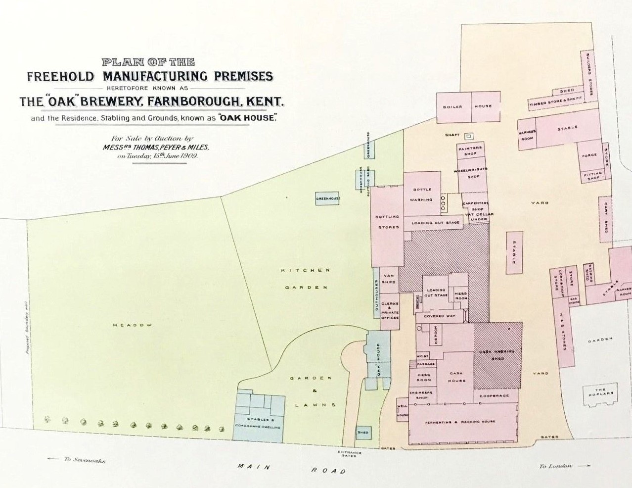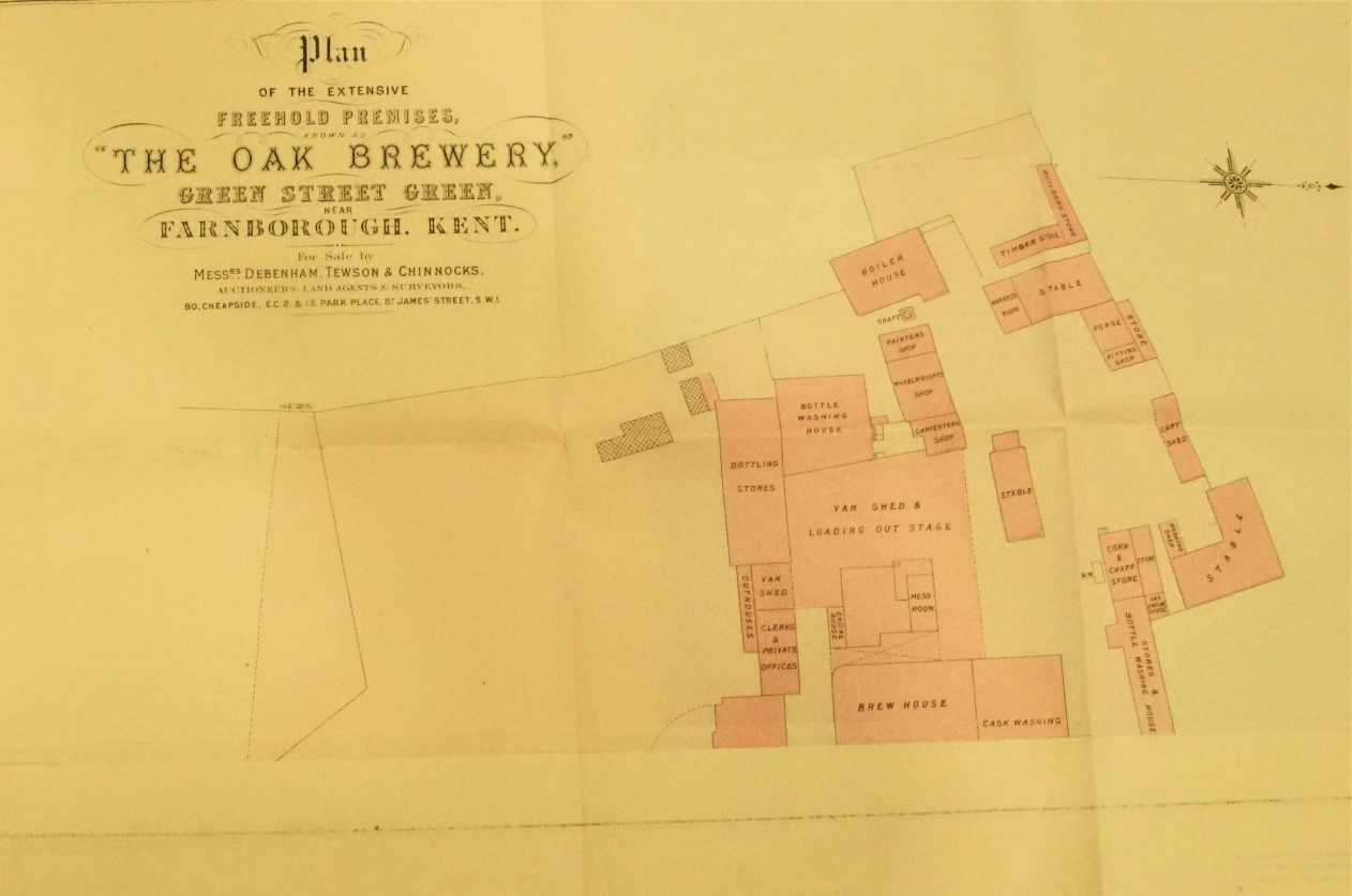 The sale included 25 acres of land in Green Street Green and elsewhere, comprising the brewery (including the offices and gas works) a farm , houses and stabling, plus sundry other land and cottages offered leasehold. This is the plan included with the aucrtion papers, it is dated 15th June 1909.