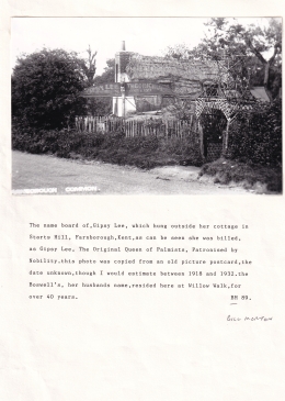 Gypsy Lee, who was 81 years of age, was the daughter of the equally famous Gypsy Lee of Brighton, and like her parent she had a nation wide reputation as a palmist and fortune teller. Among her patrons were people from all classes of society, from the poorest to the greatest in the land. Lords and dukes were not ashamed to listen to her advice, and throughout the district she was a familiar figure … She owned property in many places, and spent six months of the year at Ramsgate, where she had a home, Margate, and other resorts. The other six months were spent as a rule in her cottage at Willow Walk, Farnborough. Her husband, Mr. Levi Boswell, the king of his clan, died in 1924 and the magnificence of his funeral at Farnborough is still remembered. The traditional cortege with black horses and outriders, and the following of hundreds of his 'subjects' will be repeated today (Friday) at Mrs. Boswell's funeral. She leaves three sons, Herbert, Kenza, and Levi Boswell, and a daughter, who are also well known, though the daughter is at present lying ill in hospital. One of the sons is a well known figure at Blackheath with his donkeys.