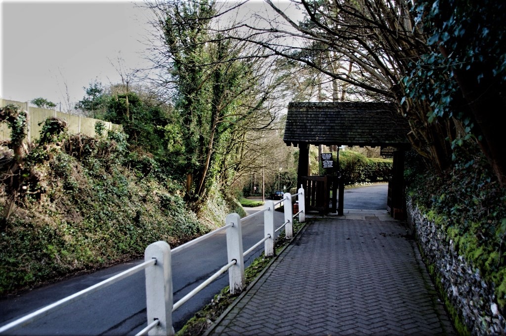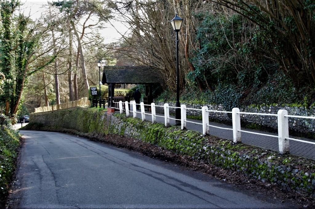 At the foot of Church Road (formerly called Church Lane) is the site of a former short road leading to the main drive to the High Elms mansion, shown to the right in these photographs. The driveway has now reverted to woodland, and is difficult to make out.