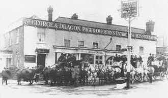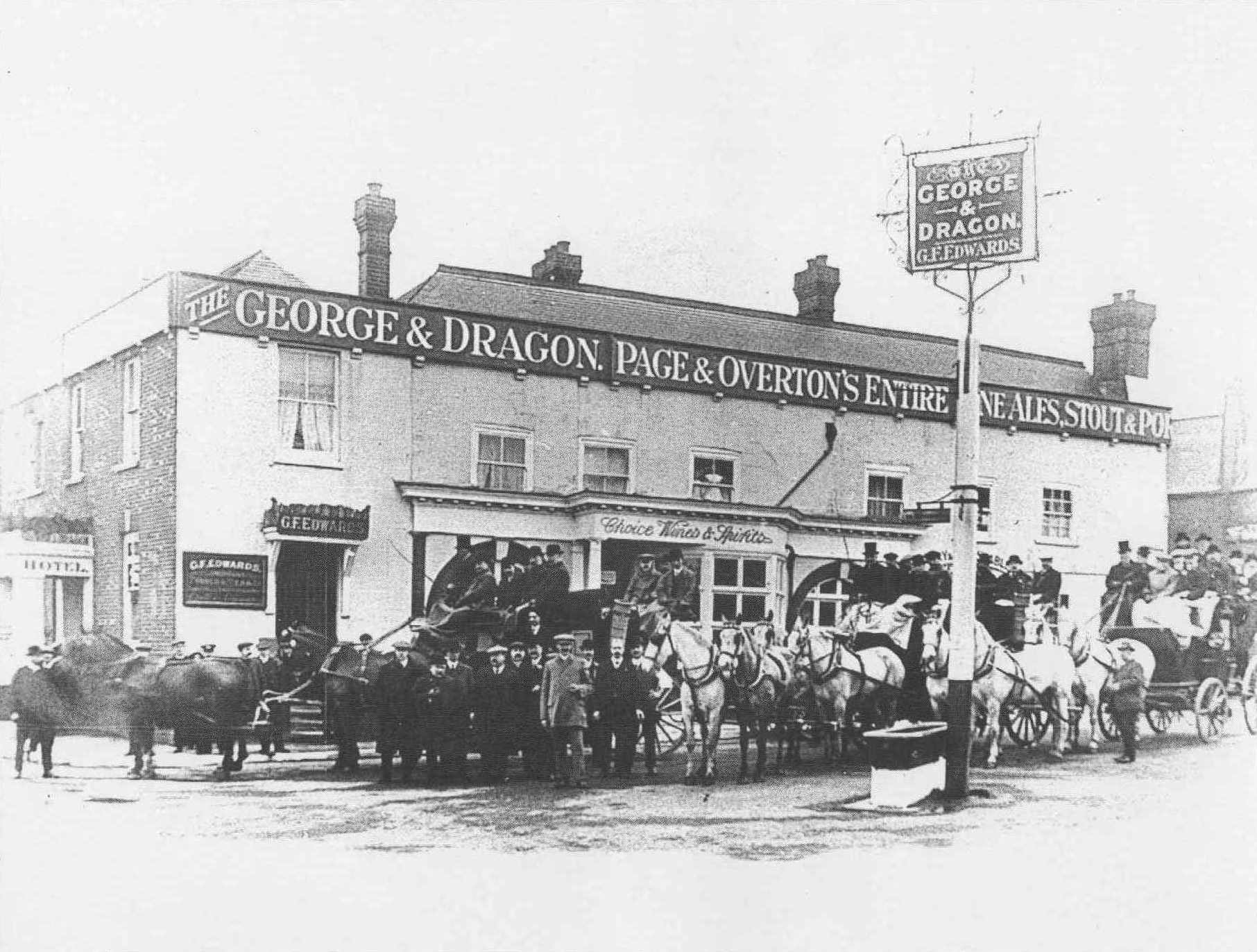 The principal building at the junction between Church Road and the High Street was for many centuries the George and Dragon Inn. This dated from the 16th Century, and was used as a coaching inn. It was replaced by a new building also called The George and Dragon in 1937.