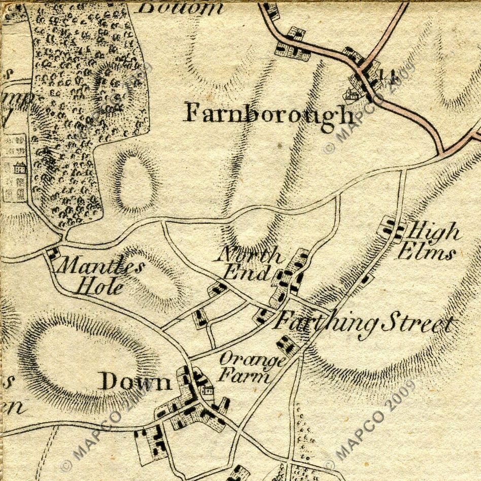 But go back to before the early part of the nineteenth century and it would have looked very different. The present road to Green Street Green along what are now the High Street and Farnborough Hill was not established until about 1800, before this Church Road was the main, indeed the only significant route through the village, see the map below which dates from 1789. Back then it wasn't even called 'Church Road'. but instead the 'High Road'.