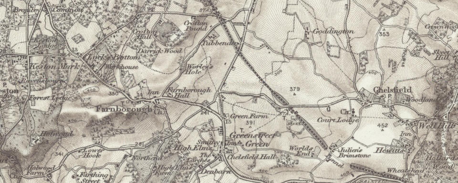 This account was first published in 1883/4, republished 100 years later in 1984.Farnborough Hall, at a short distance to the north-east of the village, is built upon an estate which appears to have been held by Simon de Chelsfield of Simon de Montfort, Earl of Leicester, in the reign of Henry III. About the middle of the fourteenth century the property was purchased by the Petleys, from whom it passed by sale to the Peches, and from that family it passed, by the marriage of an heiress, to John Hart. With the descendants of this gentleman the property remained till it was conveyed by marriage to the Dykes of Lullingston.