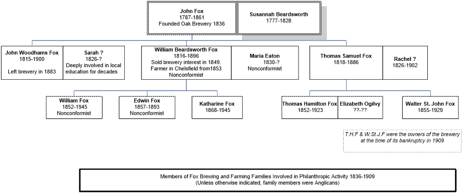 The major paternalistic activities of John Fox and his family were to provide housing for workers, education for workers’ and local children, recreational and sporting amenities for workers and community, and to facilitate Anglican worship. However, William Beardsworth Fox, baptised into Anglicanism, became a Nonconformist and farmer in Chelsfield, helping to found a Methodist Chapel there. Later, he and sons William and Edwin became Congregationalists. When John Fox died in 1861, sons Thomas Samuel and John Woodhams continued brewing, until in 1883 the latter sold his share to his brother. Thomas Samuel died in 1886, leaving the brewery to sons Thomas Hamilton and Walter St. John, who ran it until its 1909 closure.
