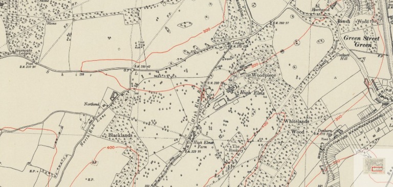 The main access drive from the mansion site leads down to Shire Lane, the border with Farnborough Parish, and then used to continue directly up to Farnborough village, via a short drive connecting to Church Road. This drive has now reverted to woodland.