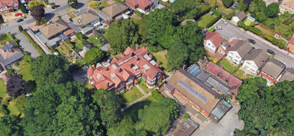 The small orchard is now an area of detached private houses and the original front drive and garden area have been redesigned to allow three pairs of substantial semi-detached homes to be built with a new narrower access road to the main house, which has been split into 11 luxury flats. A further road immediately parallel gives public access to the sports grounds and the baths area, and to the 11 garage block built behind the rear garden of the house.