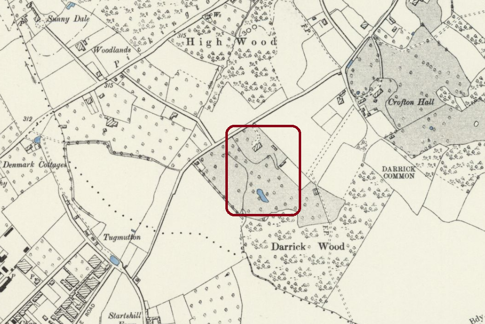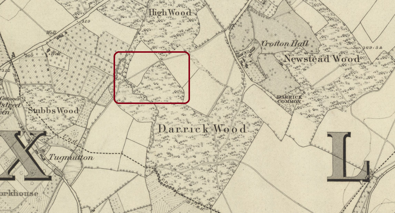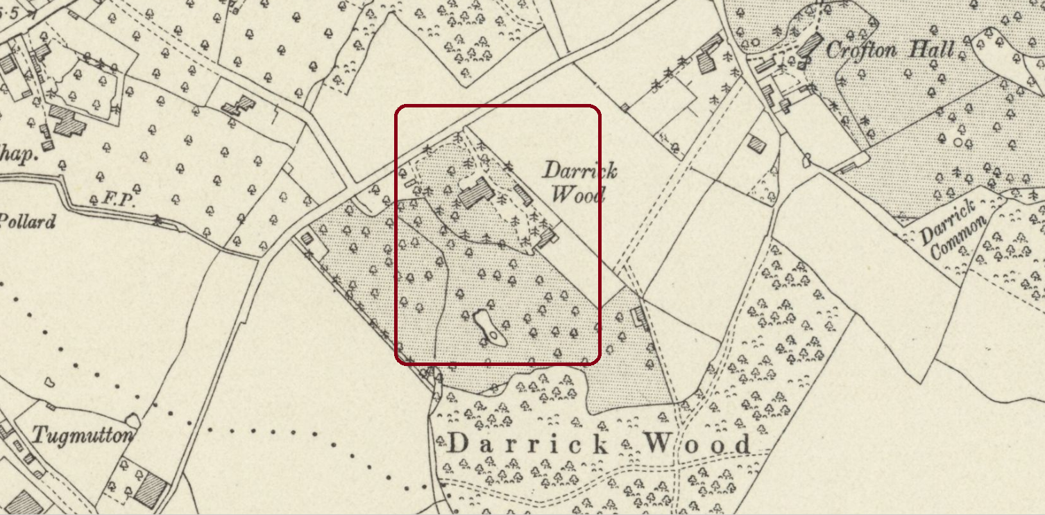 The 1863 OS map (scale 1:2500) and that of 1871 (scale 1:10000) show no boundary between the two woods and describe the whole area as “Darrick Wood”.