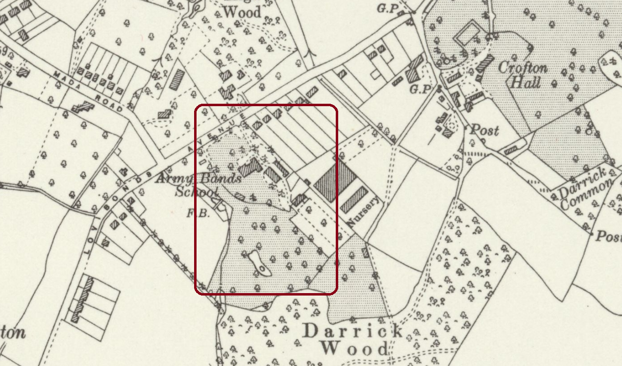 Most of the woodland has been replaced with open parkland. Key changes have been made to the boundaries of the 1841 woods and fields. Access has been improved from the east, the Crofton Hall road. The old track, now clearly the road known today as Lovibonds Avenue, and the stream are realigned and straightened. The stream is culverted under the road. The straight western boundary is a shelter belt of mixed coniferous and deciduous trees.